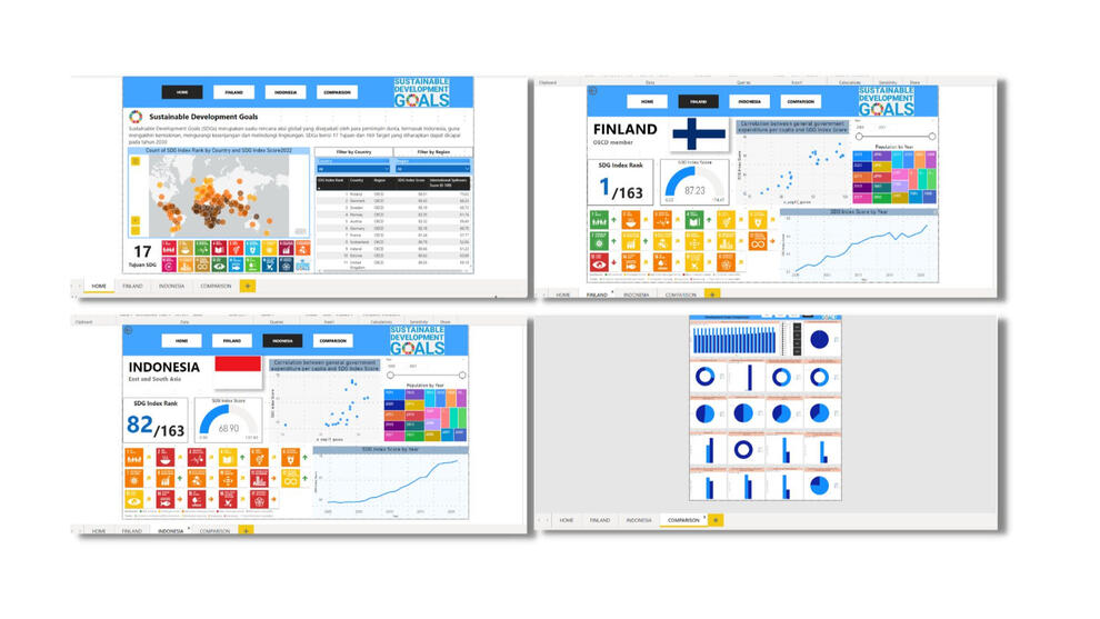 A Power BI dashboard project comparing each category of the Sustainable Development Goals (SDGs) of Finland, which ranks first, with Indonesia to gain insights into what actions can be taken to improve Indonesia's conditions. Developed an interactive Business Intelligence dashboard using Power BI to facilitate the comparison of Indonesia and Finland's progress across 17 Sustainable Development Goals (SDGs). This dashboard provides stakeholders and decision-makers with strategic insights for impactful policy changes. The project involved leveraging data analysis, visualization, statistical techniques, and R programming to create a comprehensive comparative tool.