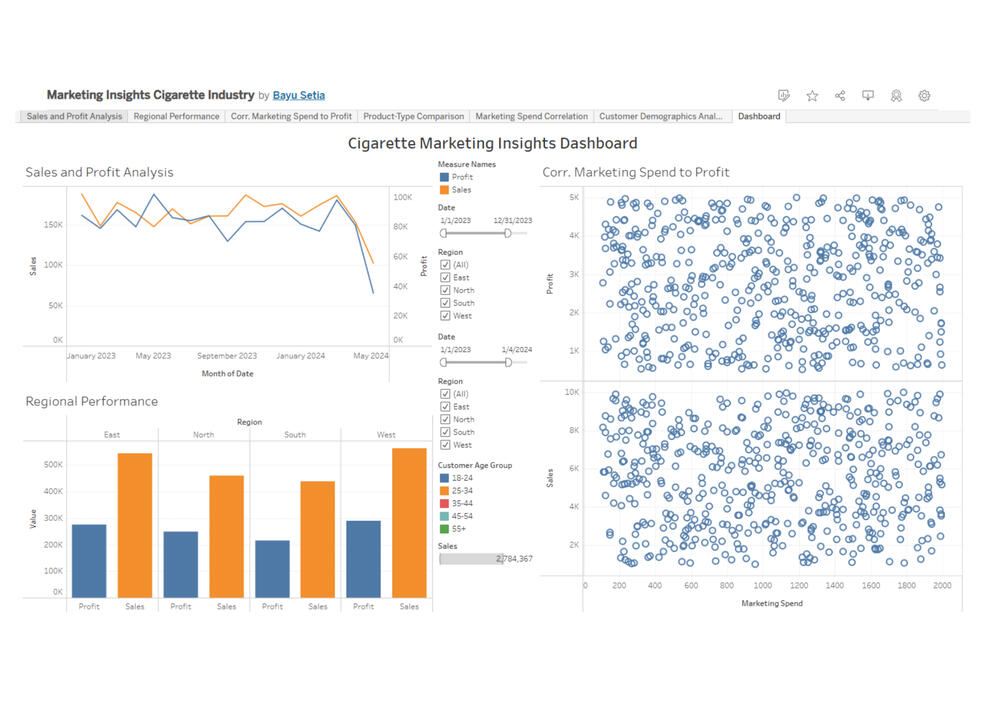 In the competitive landscape of the cigarette industry, leveraging data to understand consumer behavior and market trends is vital for effective marketing strategies. This project presents a Tableau dashboard designed to visualize key insights from sales and marketing data, including sales performance, marketing expenditures, and demographic segmentation.